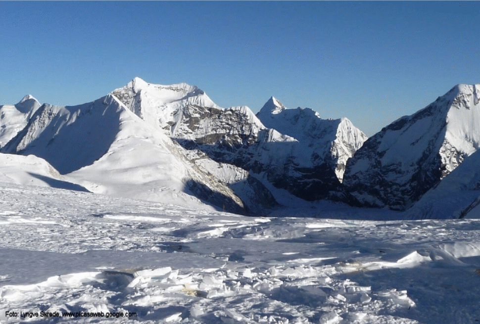 climbing equipment, crampons, ice axe, tying knots and climbing ropes. The Chulu East Peak